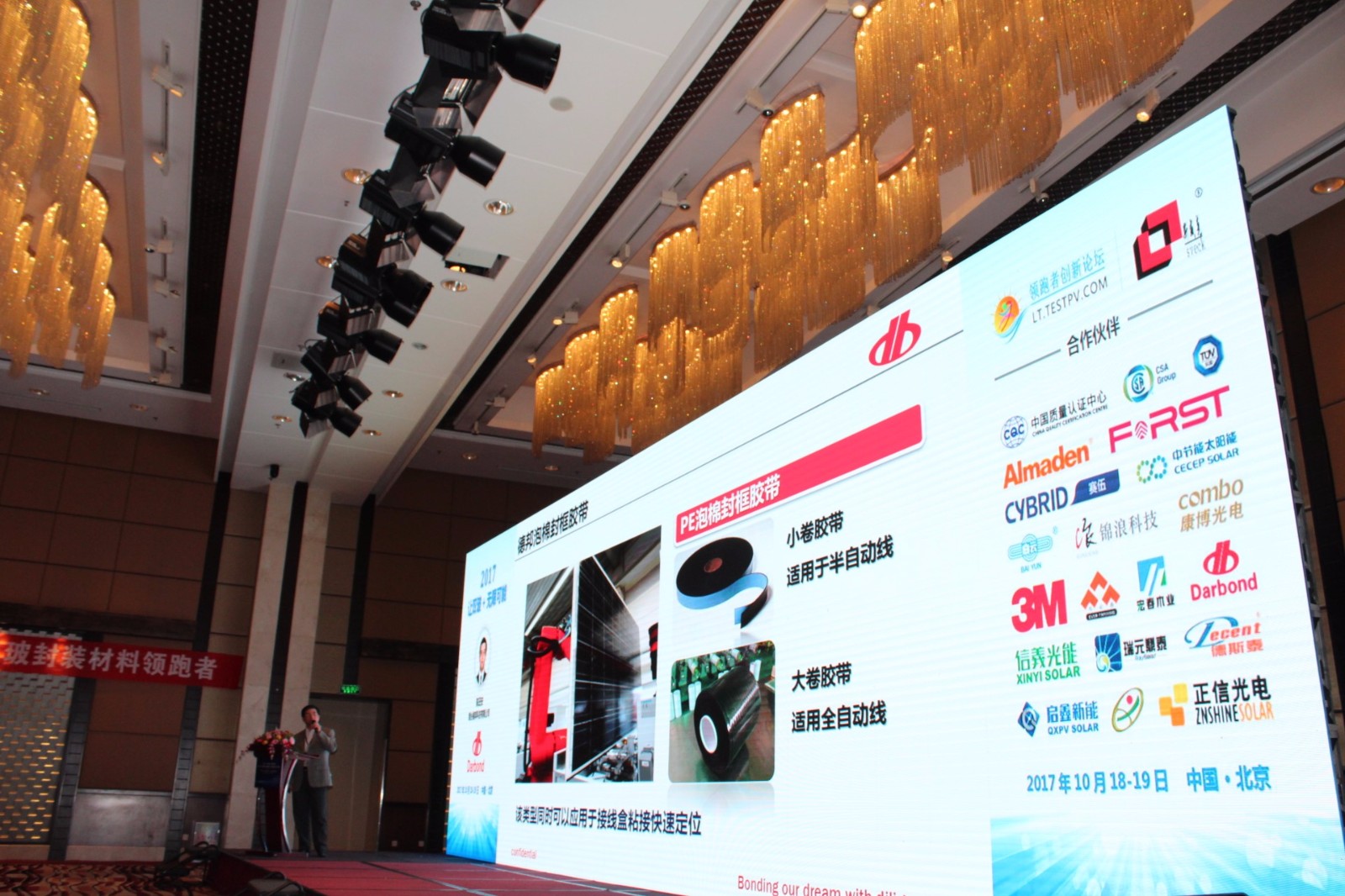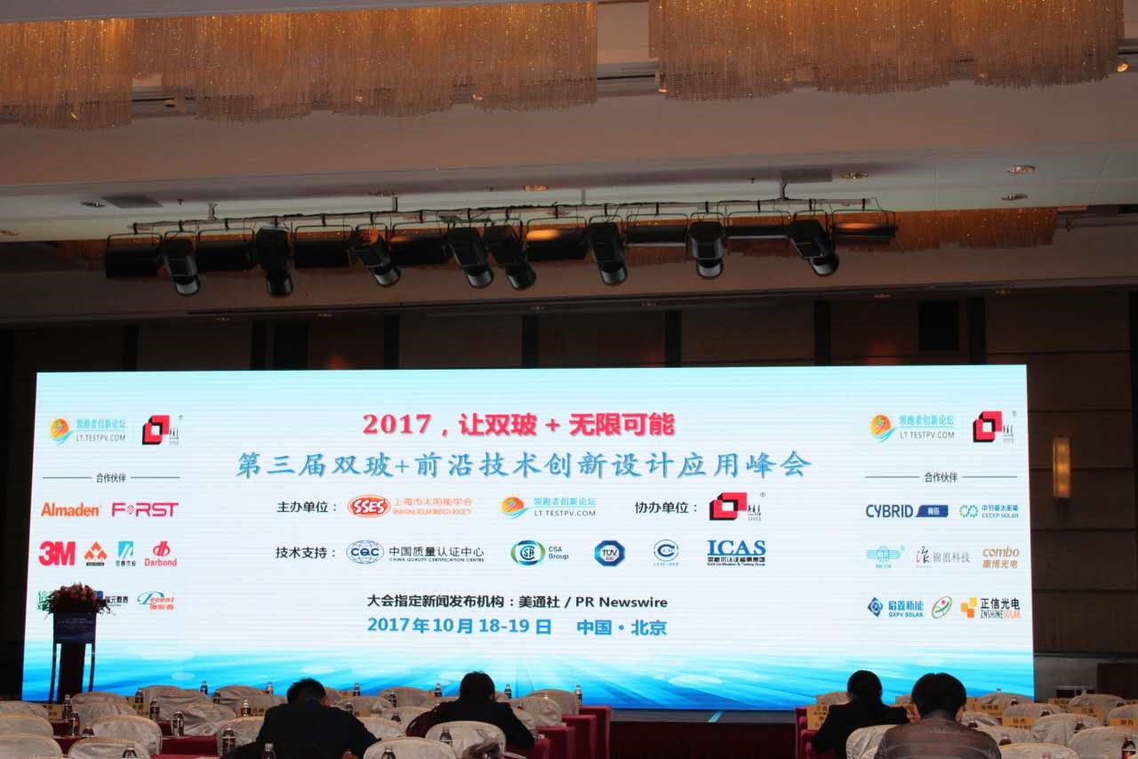 鑒于此,由上海市太陽能學(xué)會(huì)、中國光伏領(lǐng)跑者創(chuàng)新論壇聯(lián)合主辦的“第三屆‘雙玻+前沿技術(shù)’創(chuàng)新設(shè)計(jì)應(yīng)用峰會(huì)”于2017年10月18-19日在北京臨空皇冠假日酒店隆重召開。德邦科技致力于光伏行業(yè)發(fā)展,CEO陳田安博士此次作為受邀嘉賓,攜光伏事業(yè)部和市場部專業(yè)人員參加了會(huì)議,同時(shí)發(fā)表了專題演講。