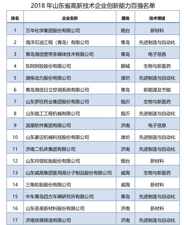 (齊魯網(wǎng)7月9日訊)山東省科學(xué)院情報(bào)研究所、山東省科技統(tǒng)計(jì)分析研究中心和山東省科技發(fā)展戰(zhàn)略研究所聯(lián)合在濟(jì)南舉行2018年山東省高新技術(shù)企業(yè)創(chuàng)新能力百?gòu)?qiáng)發(fā)布會(huì),向社會(huì)發(fā)布了山東省高新技術(shù)企業(yè)創(chuàng)新能力100強(qiáng)企業(yè)名單(以下簡(jiǎn)稱“百?gòu)?qiáng)高企”),萬(wàn)華化學(xué)集團(tuán)股份有限公司、濰柴動(dòng)力股份有限公司、浪潮集團(tuán)有限公司和煙臺(tái)德邦科技有限公司等企業(yè)從全省范圍內(nèi)的高新技術(shù)企業(yè)中脫穎而出,躋身“百?gòu)?qiáng)”行列。這是山東首次評(píng)選和公布高新技術(shù)企業(yè)創(chuàng)新能力百?gòu)?qiáng)榜單。